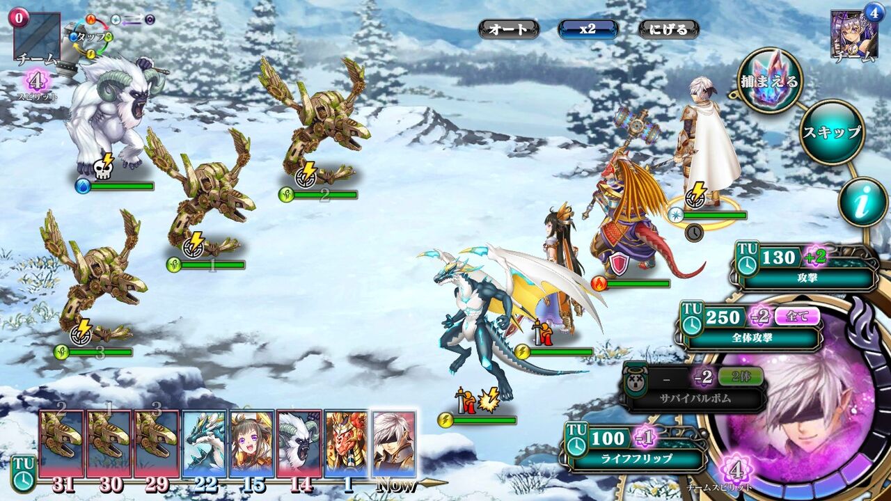 理想は1体だけのパーティーで様々な属性を使うことですが、このように自分が1体パーティーでも相手は8体で来る場合もあります。敵の数が少ない場合はレベルが高いキャラ、多い場合はレベルが低いキャラが出てきますが、レベルが低いといえど状態異常を入れられリンチされるとさすがに負けるので、難易度が上がってくると複数体のパーティーを組む必要が出てきます。