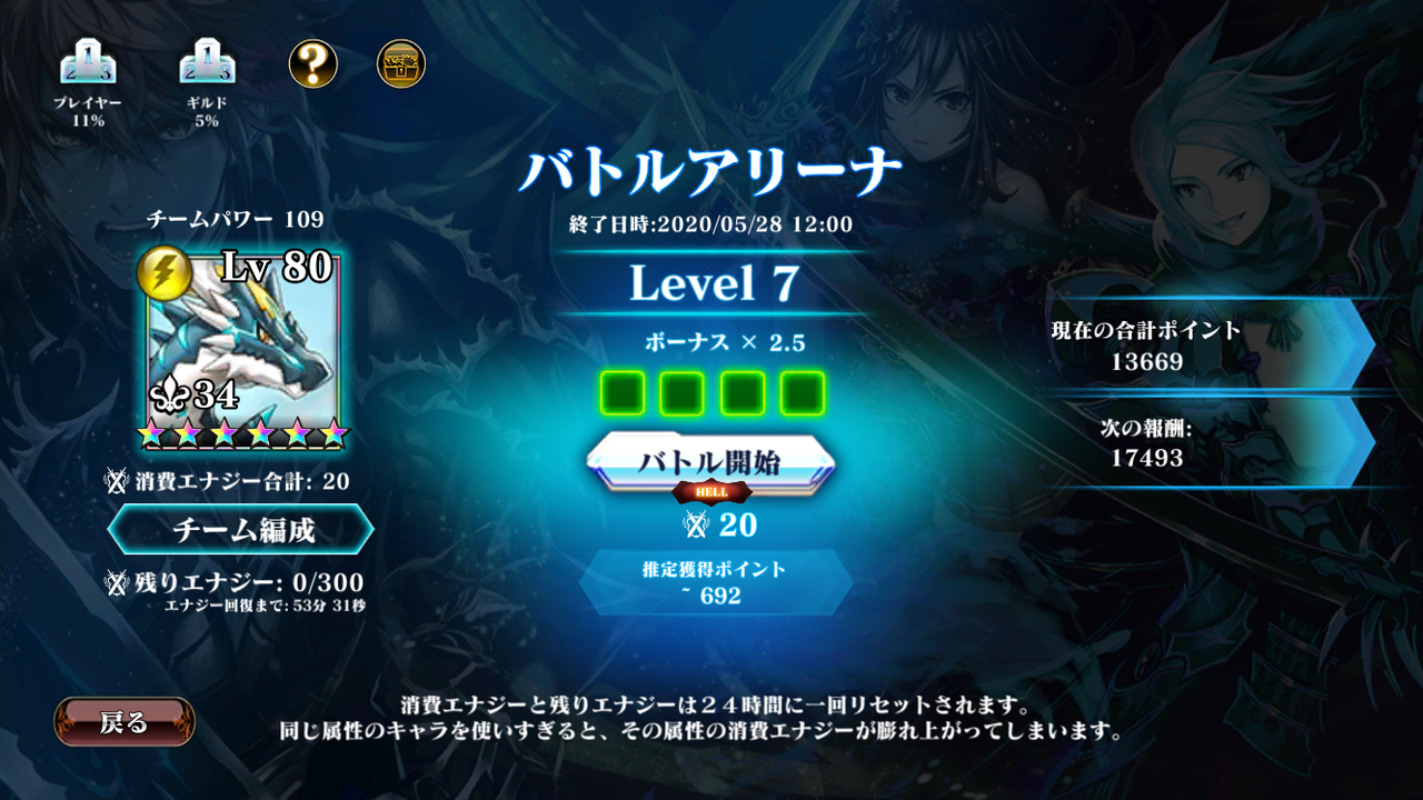私の手持ちキャラクターは↑こんな感じで、ガチャの引きが良いほうとはいえませんが、2日目終了時で上位11%に入ることができました。バトルアリーナは難しいですが、システム上「強いパーティーでぶん殴る」ができないので、SSRキャラが少ない人にもチャンスがあります!