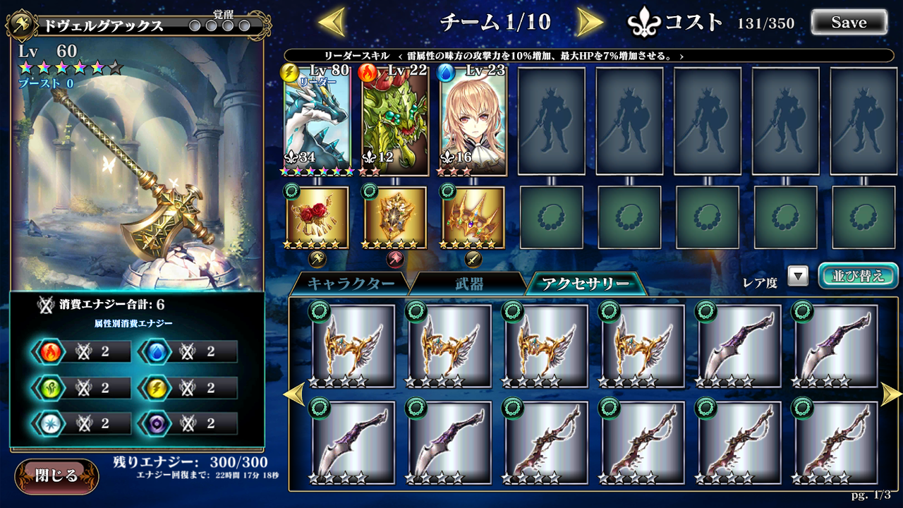 重要なのは「できる限りパーティーに入れるキャラを減らすこと」と「属性を使い分けること」です。ステージレベル3くらいまでは敵もそこまで強くないので、育ったキャラクターなら単体で勝つことも難しくありません。私の場合はステージレベル3の途中まではレベル80のアルタイラスだけのパーティーで進み、ラストでレベル30くらいのキャラ8体のパーティーにリンチされて負けてしまいました。このあたりから少し難易度が上がっているように思います。逆にいうと、そこまでは単体で強いキャラ(アイアンハートやドレイン持ちなど)単体をステージごとに切り替えて使っていけば1バトルあたりの消費エナジーは2で済んでしまうんですね。
